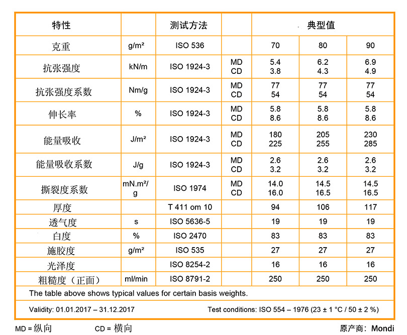 克重:基本重量范围70-90 g/㎡ 原料:是由漂白纯长纤硫酸盐纸浆制成 批准:满足德国和FDA关于食品接触类纸张的规定 认证:通过质量管理体系ISO9001和环境管理体系IS014001认证