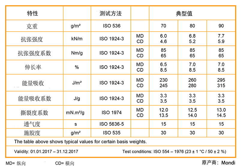 克重:基本重量范围70-90 g/㎡ 原料:是由未漂白纯长纤硫酸盐纸浆制成 批准:满足德国,CONEG 和FDA关于食品接触类纸张的规定 认证:通过质量管理体系ISO9001和环境管理体系IS014001认证